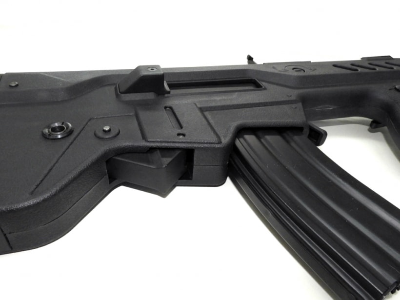 [S&T] Tavor-21 PRO Ver フラットトップ カービンモデル BK 発射不良若干 (訳あり) 製品詳細画像4 マガジンのうしろにボルトリリースボタンがある。実際にボルトをリリースするときのカシャっていう音と振動が楽しめる。