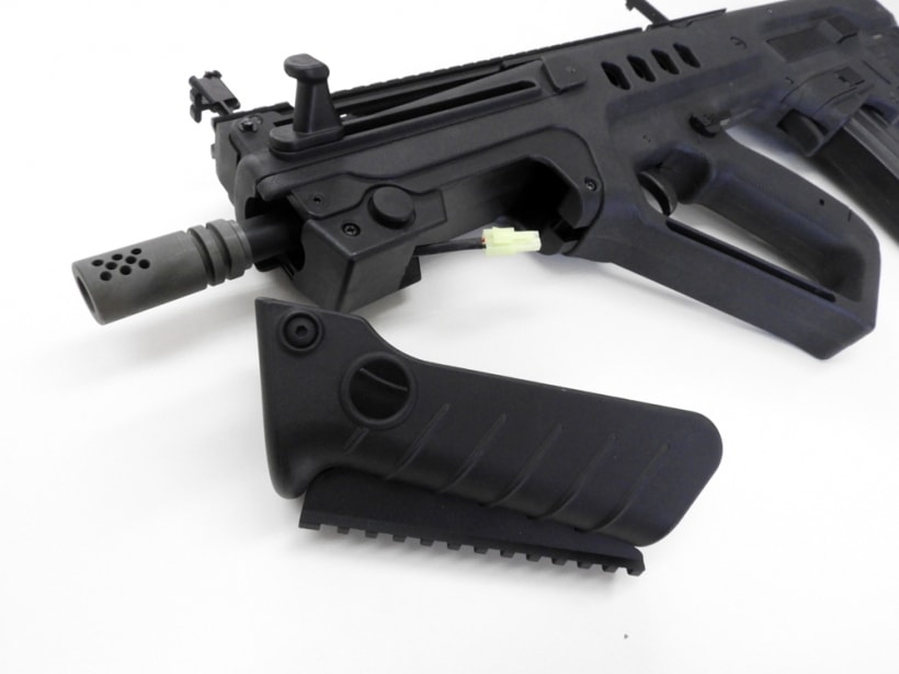 [S&T] Tavor-21 PRO Ver フラットトップ カービンモデル BK 発射不良若干 (訳あり) 製品詳細画像7 バッテリーはハンドガードがボタンで外れるようになっていて、出し入れがやりやすい。