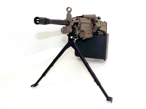 外観はフルメタルでTOP製のミニミにも負けない重厚な造り。詳細に比べるとメカ部分やHOPの性能は国内産の電動ガンに軍配が上がるが、このミニミの雰囲気を味わうには十分おすすめできる一品。SAW(分隊支援火器)の決定版。歩兵120人分の火力を持つといわれ、5.56の弾薬を使用するため、M16などのマガジンも使用できる。装填数2500発のBOXMAGAZINE付き。