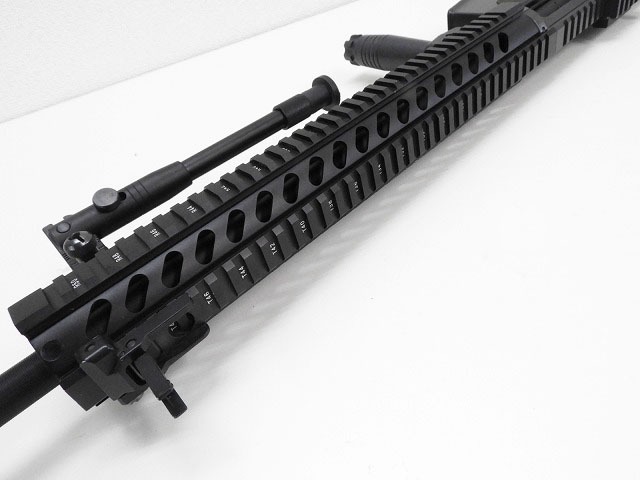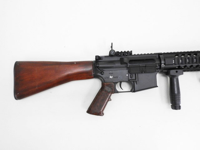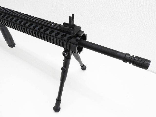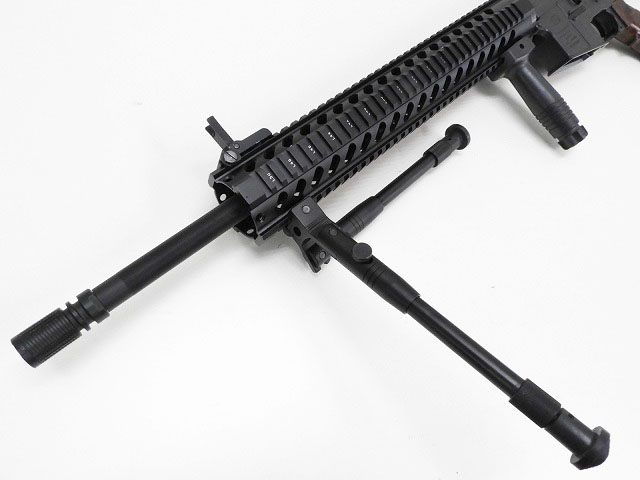バイポッド、フォアグリップ付き。木製ストック取り付け済み。