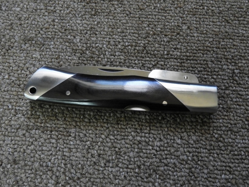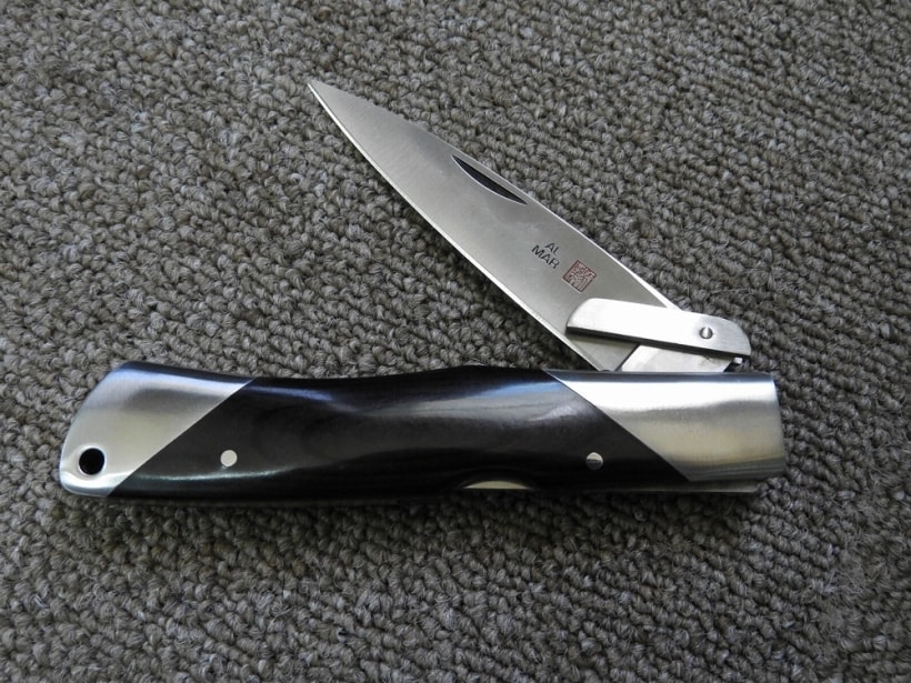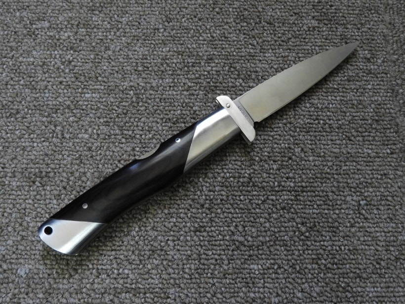 シースナイフのようなヒルト(鍔)が別に持ち上がってくるユニークな機構を備えたフォールディングナイフ。