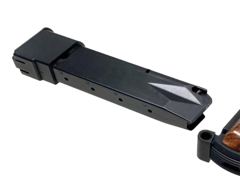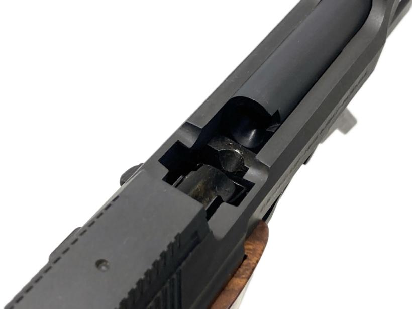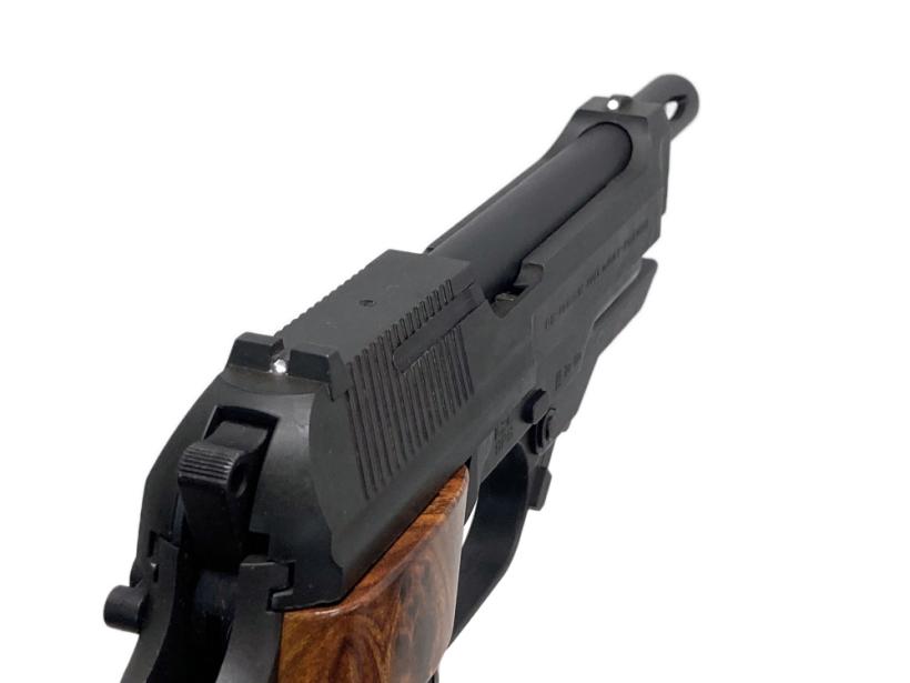 ガスポートが空けられたロングバレル、ロングマガジン、角張ったスライド、大型化されたトリガーガード、反動を制御するフォールディンググリップが個性を主張している。