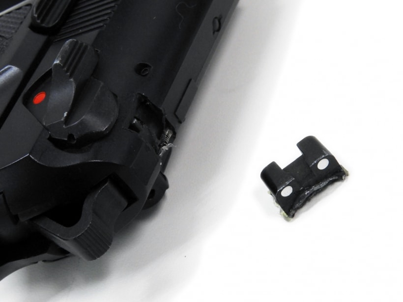 過去にリアサイトが接着されていた跡があり、かつ接着が外れてしまっています。