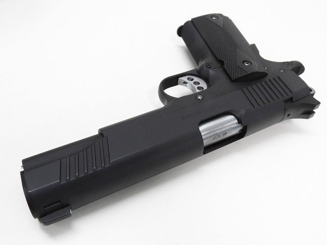 ロサンゼルスSWAT正式採用拳銃"LAPD SWAT CUSTOM II"。 5mm軸タイプの片側セフティやリアルサイズトリガー、ラバーコーティング・ダイキャストグリップの他、シリーズ70にて採用され好評を博している、メタルチャンバーを採用し、スライドストップ部分にはノッチプレートを搭載したモデル。