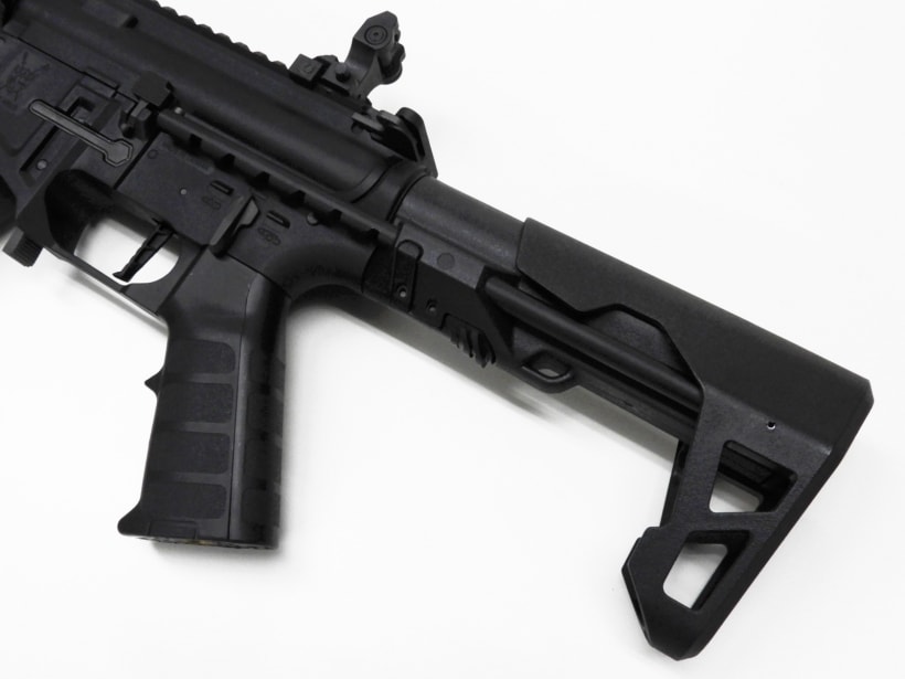 M-LOKタイプのアルミ製ハンドガードと、7ポジションに調整可能なスライドストックを M4に似たレシーバーに装備させたエアガンとなっており、馴染みやすくも独特な外見