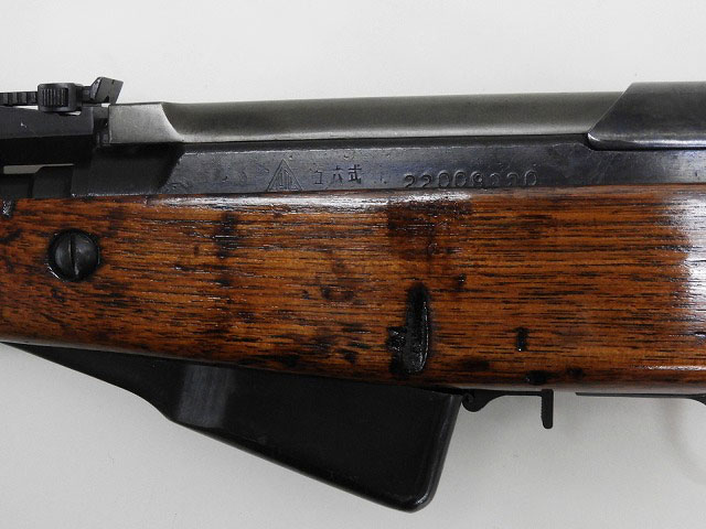 機関部に三角形の中に記号のような文字の造兵廠刻印と漢字で五六式と刻印が入っています。スパイクは溶接で固定されており開く事は出来ません。木製ストックとハンドガードは単材で作られています。クリーニング・ロッド付。