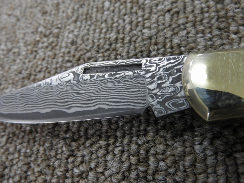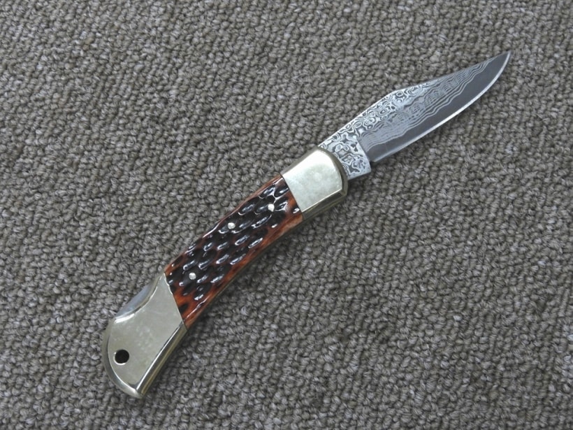 ダマスカス鋼ブレードとジグド・ボーンのハンドルを持つフォールディングナイフ。