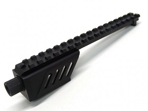 東京マルイ電動グロック18C用アタッチメントマウントレイル。装着すると、G18Cをよりタクティカルに使用するためのマウントレイルと、銃口部にサイレンサー用14ミリ逆ネジが装備できる。