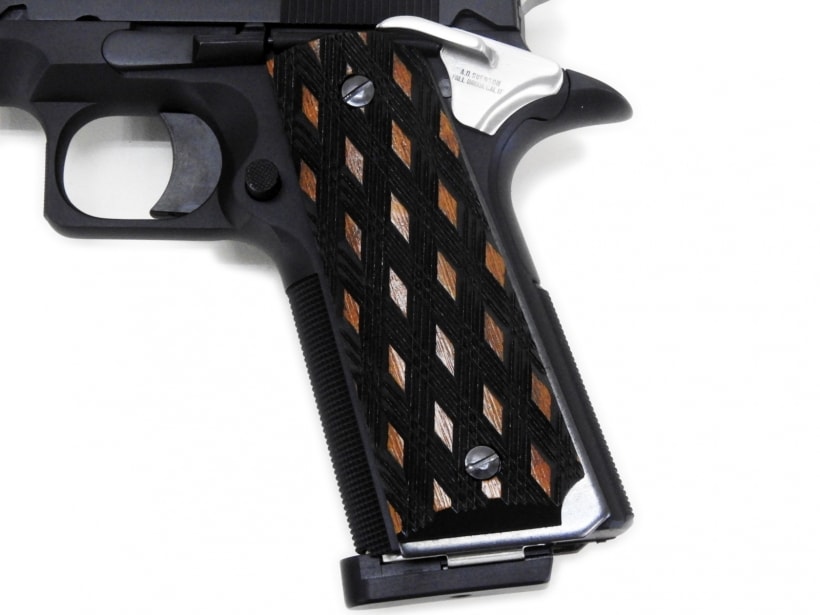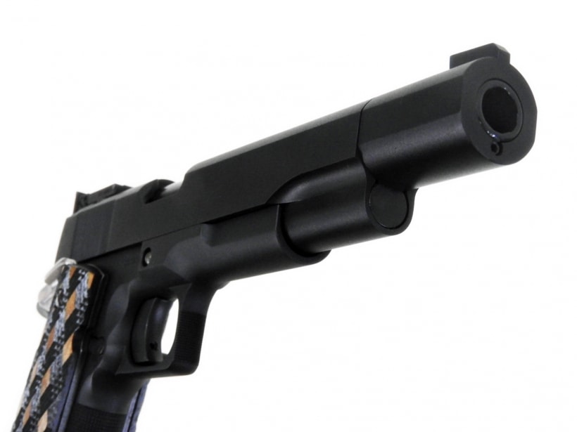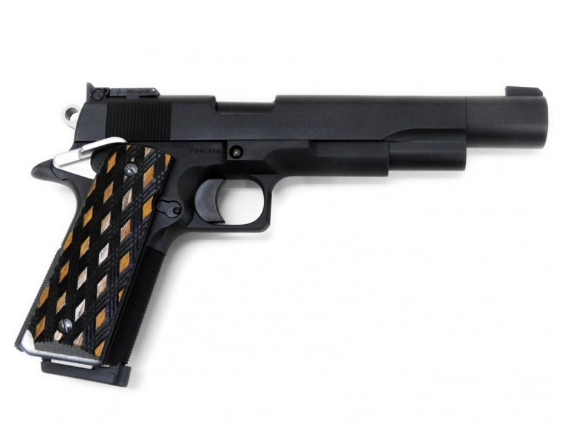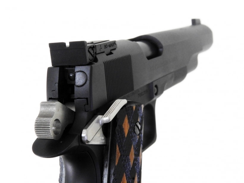 ガスポートのないコンペンセイターやプレートの入ったダイヤカットグリップなどが特徴的なレースガン。もちろんグリップセーフティーはオミットされています。