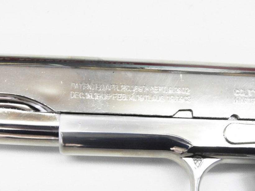 「大口径主義のアメリカ」の象徴とも云えるシングルアクション自動拳銃。最初期の米軍採用モデルの制式名称は、「Automatic Pistol, Caliber .45, Model of 1911(自動拳銃 .45口径 1911年型)」。最もよく知られる「コルトガバメント」の名称は、コルト社製の民間モデル「Colt Government Model(コルト社 政府モデル)」のことを差す。