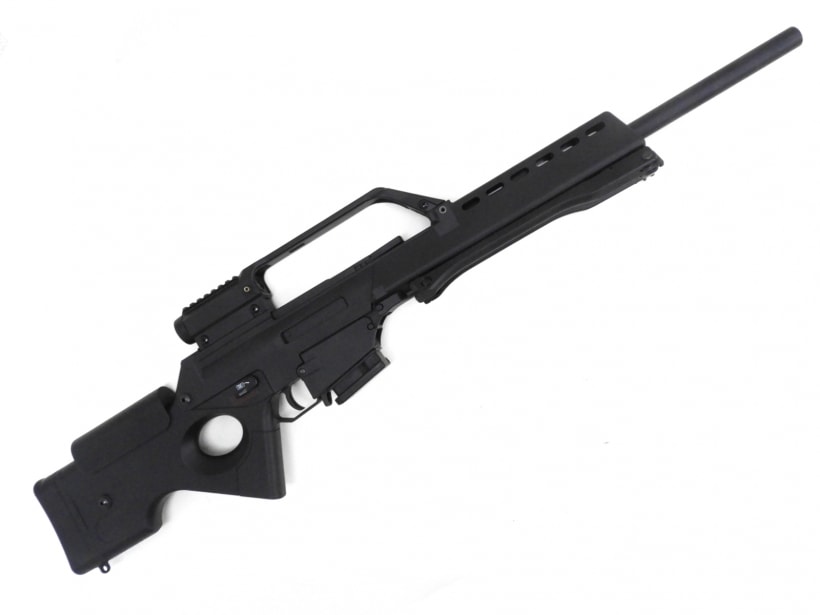 G36シリーズのローエンフォーススナイパーモデルで、銃上面のキャリングハンドル部分はオープンサイトを省略しスコープを取り付けることを前提に設計されたミリタリースナイパーモデル。