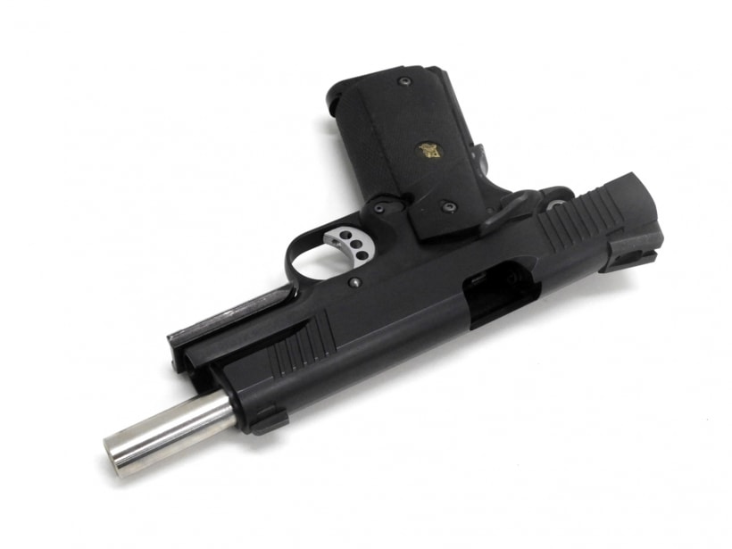 ハンドガンの場合は全体を金属性とする組み換え、エアソフトガンの場合は射出エネルギー0.98J以上にする改造を行うと銃刀法違反となります。HFC134a仕様のガスガンにCO2用マガジンを組み込む、スライドを金属製の物に差し替える等、簡易な改造でも罪に問われる可能性がございますので、絶対にお止めください。