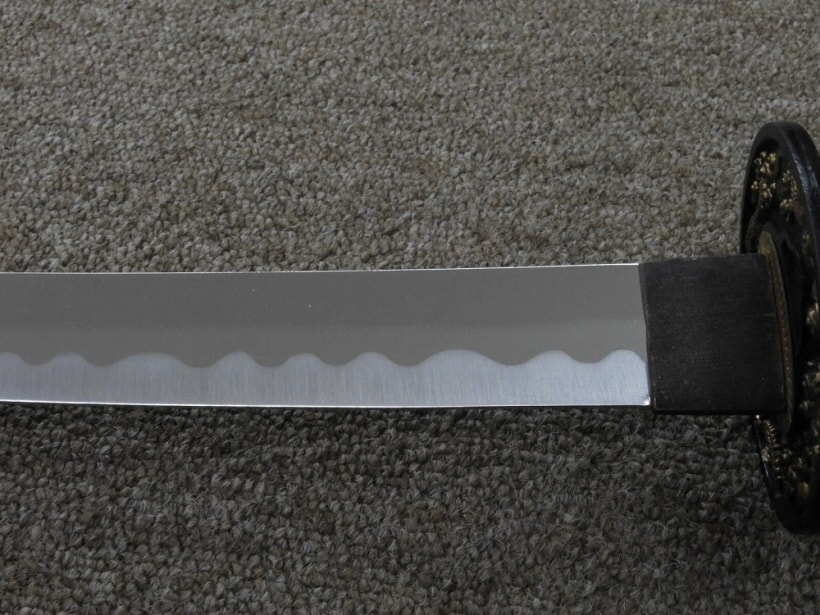 柄の鮫革はプラスチックでディテールの質感はそれなりではあるものの、互の目(ぐのめ)の刃文も鮮やかで遠目には十分な外観。デザインも伝統的でコスプレや舞台小道具向きです。