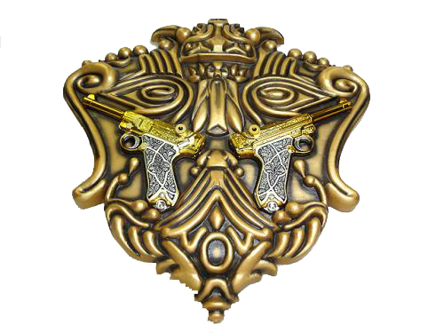 銃の取り付け位置に磁石が仕込んであり、「アシュフォード・ゴールドルガー」を2丁収納できるレリーフとなっている。