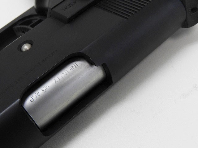 シリーズ80の刻印とコッキングのためのセレーションも後部のみでベースとなったコルト.45オートの特徴を色濃く残したデザイン。ハイキャパシティとして複列弾装のため30発の装填が可能。