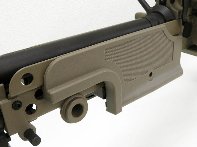MINIMI M249 MK-I TAN/デザートカラー。フルメタルでTOP製のミニミにも負けない重厚な造り。音感センサー付2500連BOXマガジン付属。