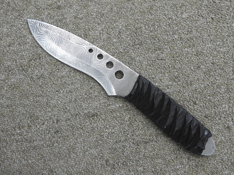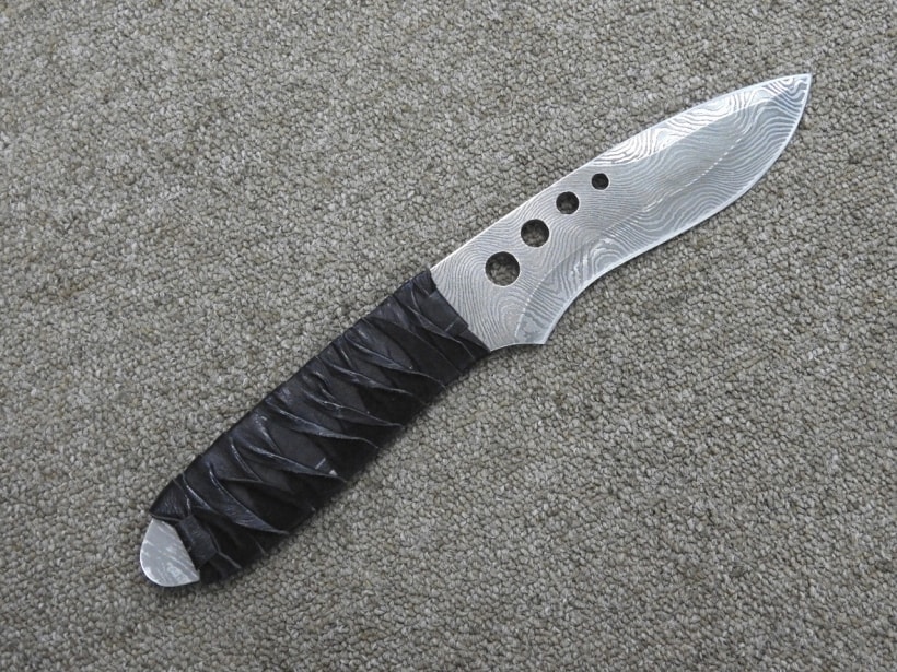 革紐巻きハンドルのブッシュナイフ。材質は断面に積層構造が見られることからプリントではなくダマスカス鋼の工法で作られていると思われます。