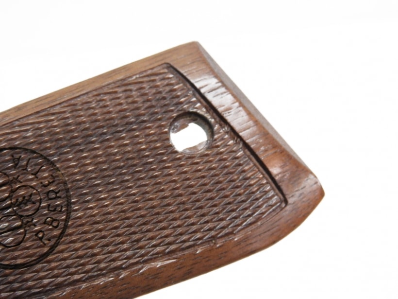 チェッカリングとベレッタ刻印の入った木製グリップ。加工されたものか、スクリューの穴が不揃いになっています。