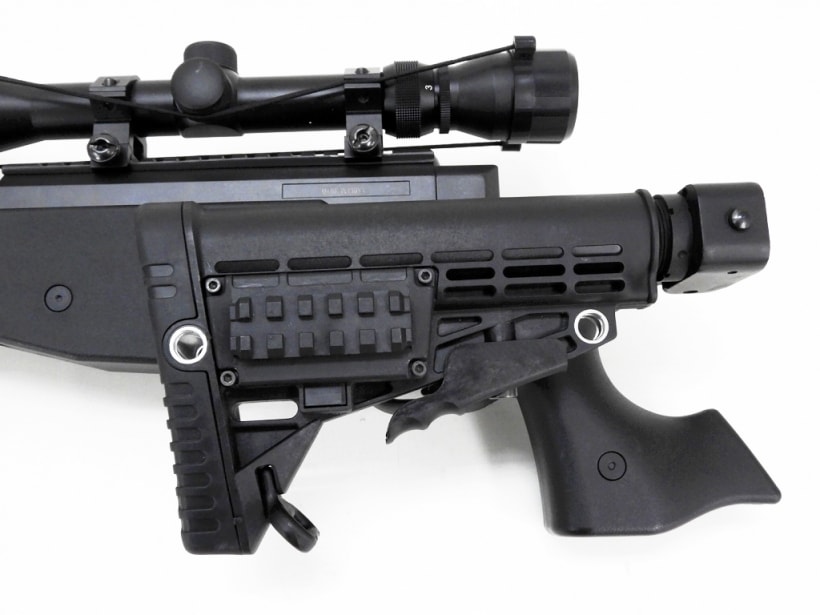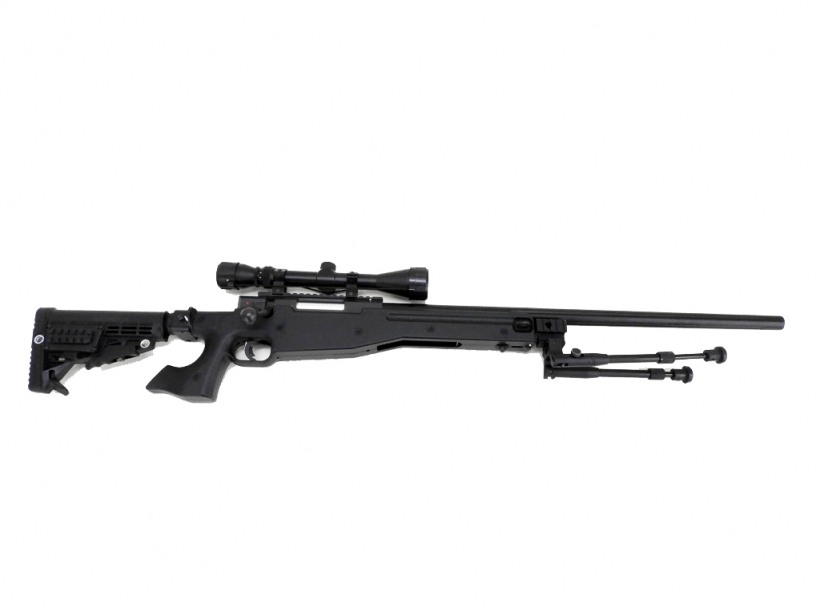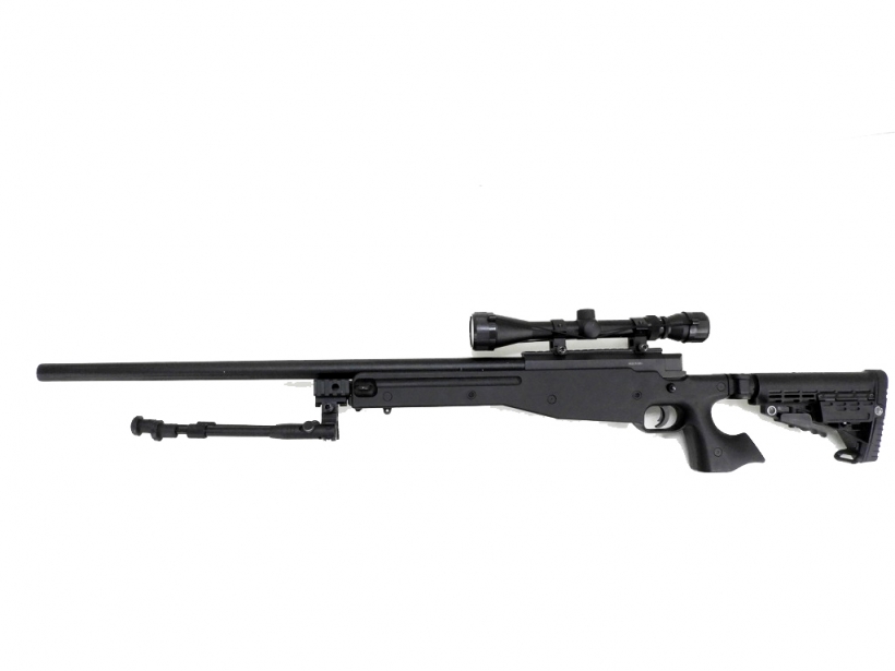 ストックにM4タイプのパーツを使用、普段M4系の銃を使う人にも馴染みやすいエクステンデットストック仕様のスナイパーライフル!!3-9倍率x40スコープ、ハイマウントリング、専用バイポッドがセットで付属しています。