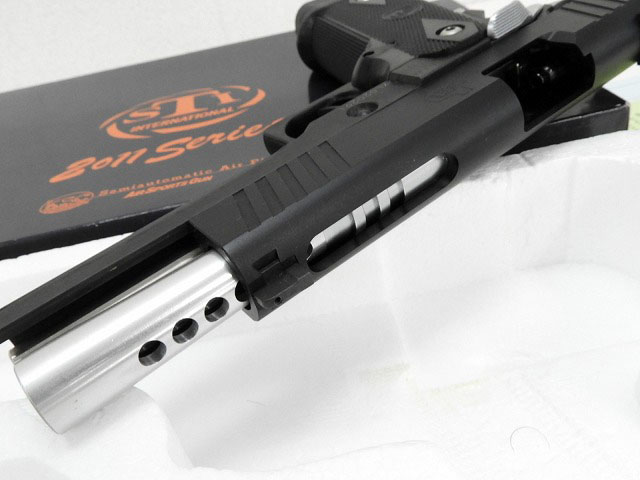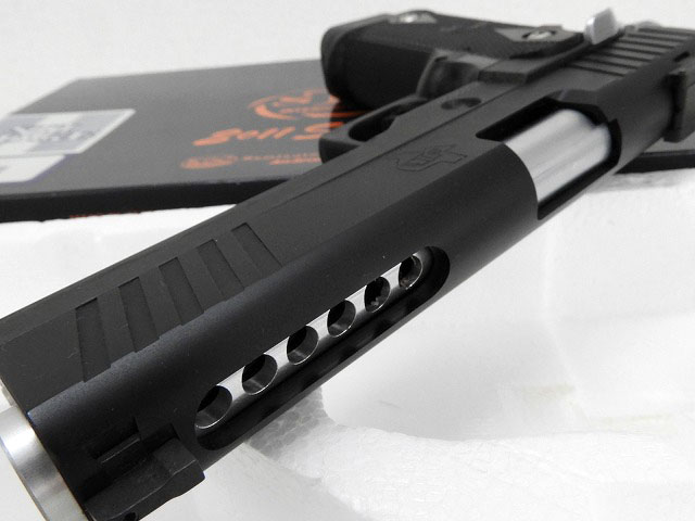 6個ガスポート付きバレル装備、イベント限定品のSTIエッジ。 アウターバレルの穴に合わせ、スライドもエスケープカットスライドとなっている。
