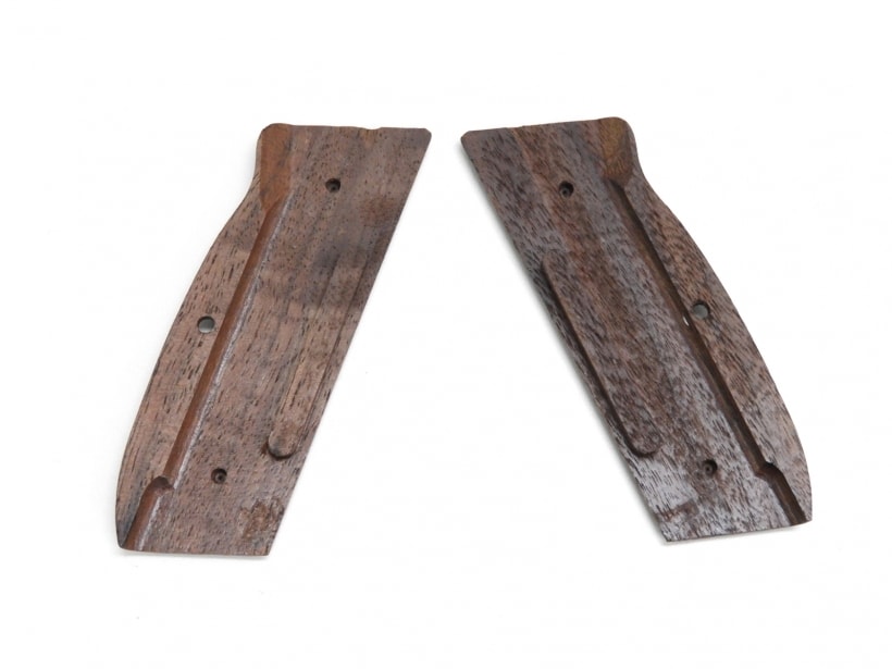 フルチェッカーの入った薄型のCZ75用木製グリップ。角のエッジがやや鋭いタイプ。MGCのCZ75には取り付けできました。