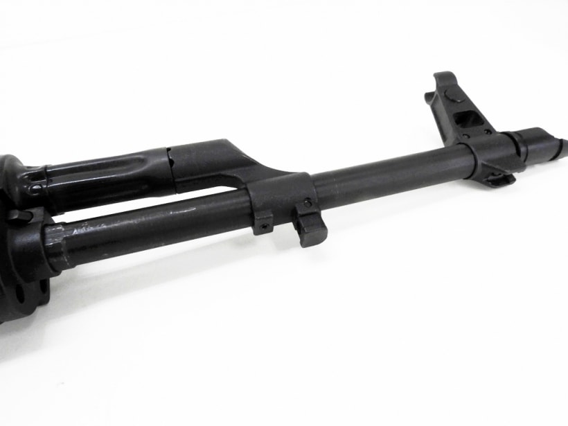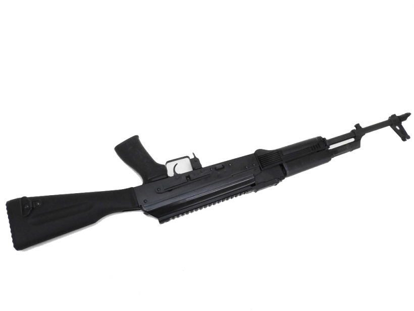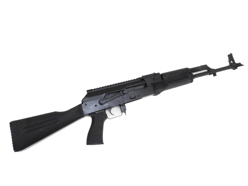 1959年にAK47の後継として配備が始まった突撃銃。AK47と構造はほぼ同一だが、プレス技術の向上により、レシーバー部を削り出しから、初期のAK47でも採用していたプレス製ボディに変更したため、生産効率の向上と軽量化に成功している。またレートリデューサーを装備している為、操作性はAK47よりも良くなっている。その他、ショルダーストックやフォアエンド、ガスポートの形状変更など、細かい変更点は意外に多い。バージョン違いとして1960年にフォールディングストックを装備したAKMSが、1975年に特殊部隊・空挺部隊向けにカービンモデルのAKMSUが開発された。AKMとは、「Avtomat Kalashnikova Modernizirovanniy;Автомат Калашникова Модернизированный(改良型カラシニコフ式突撃銃)」の略であり、マズル先端が斜めに切断されているように見えるのが最大の特徴である。これは発射ガスを上方に吹き上げて銃口の跳ね上がりを抑える、コンペンセイターの役目を果たす。なお小さな変更だが、このAKMから着剣装置が復活している。前作AK47には当初、着剣装置がなく、後にかなり苦労してスパイク状のバヨネット(銃剣)を追加した例が見られた。また、このAKM用のバヨネット(上の写真・右下に写っている物)は、サヤと組み合わせることでワイヤーカッターとして使うことができる。さらにグリップの部分が絶縁されているため、例えば通電された鉄条網などでも安全に切断することが可能。これがなかなかの優れもので、後にアメリカ軍でもほとんどそのままに取り入れられ、制式化された。