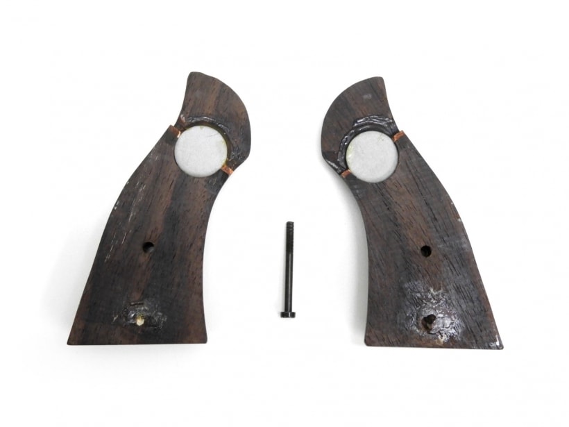 S&W Kフレーム用のスクエアバット、サービスサイズの木製グリップ。裏側に接着剤による加工がありますが仕様なのかカスタムなのかはわかりません。