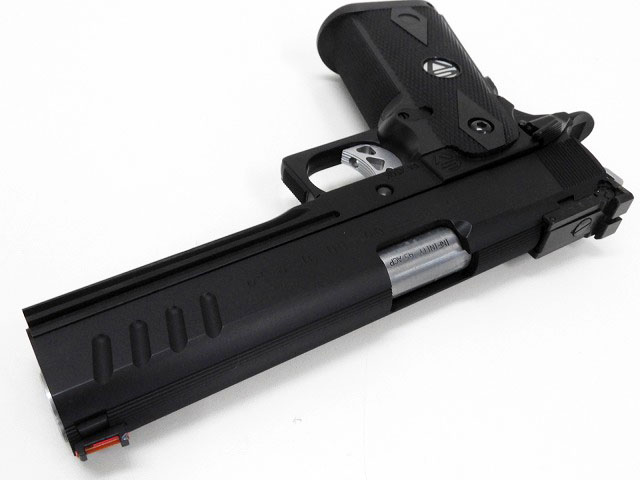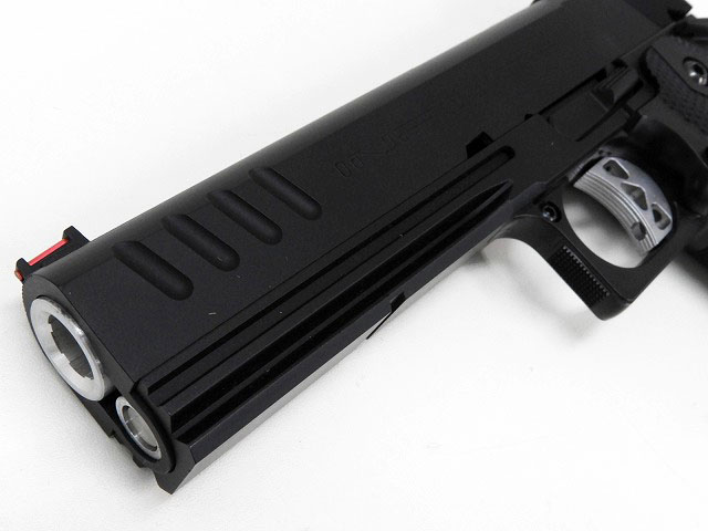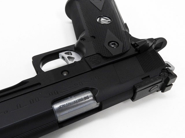 スライドは、ヘビーウエイト樹脂製のインフィニティ・リミテッド5インチスライドに、機械加工にて独特なフロントセレーションを施し、視認性に優れた集光フロントサイトと、ドット入りラージ・ボーマーリーフを採用することで、さらに狙いやすい仕様となった。
