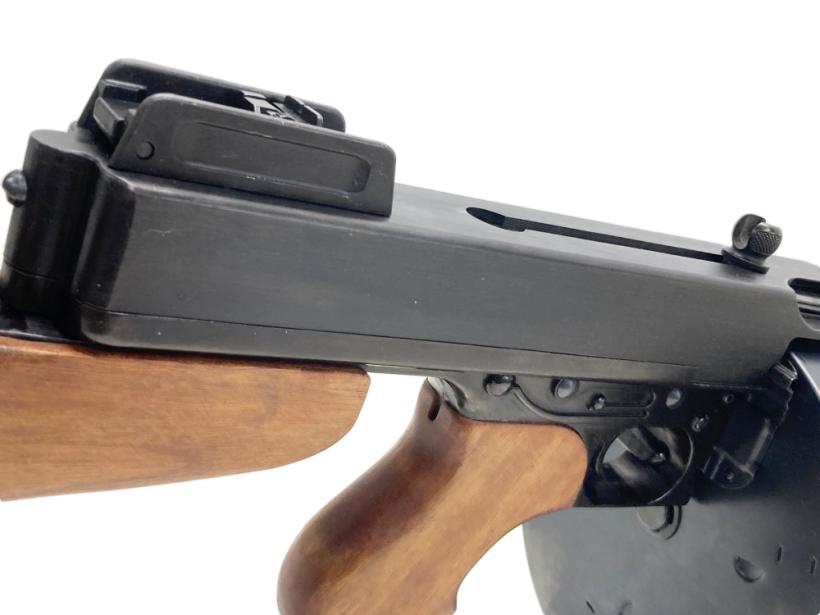 MGC製のトンプソン M1921 シカゴタイプ。ブリッシュロックというブローバック遅延機構を備え毎分約800発という連射力を持つこの銃は、その独特な射撃音から「シカゴタイプライター」の愛称でガンマニアに親しまれてきた。