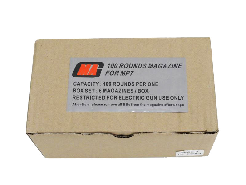東京マルイ対応、MP7電動ガン100連ロングマガジンの6本パックボックスです。