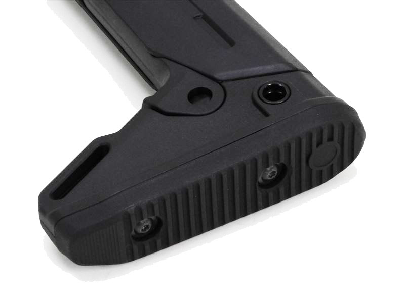 ストック後方の中心部にあるボタンを押すことでストックを伸縮させることができ、最大5段階で長さを調節することができます。