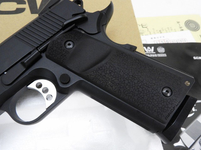 実物マグプルグリップBKを装着済みのカスタム品。 マガジンのバンパーも大きいサイズのナイトホークカスタムのマガジンバンパーとなっています。