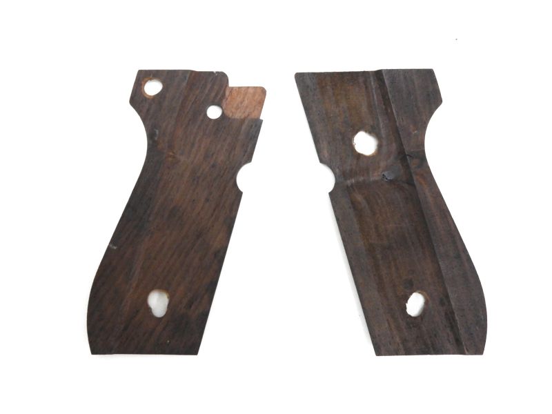 ベレッタ92シリーズ用のスムース木製グリップ。スクリューの穴が加工されて不揃いになっています。