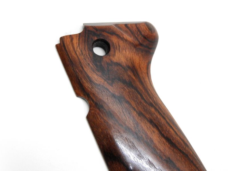 少し赤みがかった木製グリップパネル。光沢仕上げ。
