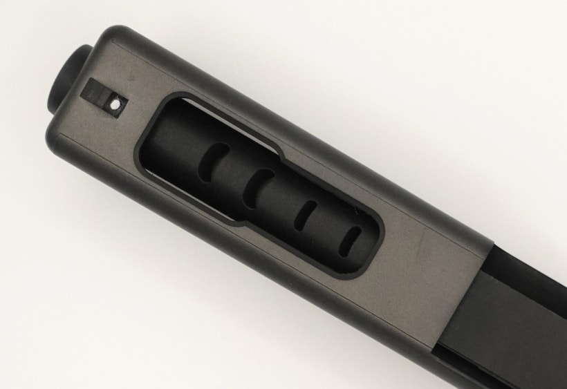 スライド上部に開けられたガスポートにより、発射時のガスを上方に逃し、銃口上昇を低減するコンペンセーターを備えているのが特徴です。
