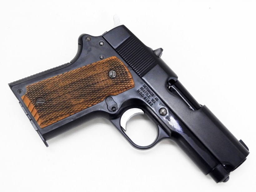 1911年にアメリカ陸軍に制式採用されて以来、1発でターゲットを無力化できる「.45口径弾」と共に、アメリカ全土で強く信頼され根付いてきたハンドガン。それがコルト社の「M1911ガバメント」だ。初期設計で既に高い完成度を持ったそのメカニズムは今だ現役であり、また多くのメーカーが様々なカスタム・モデルを生み出してきた。そのカスタム・ガバメント市場に“サブ・コンパクト”という土壌を築き上げたのが、1970年代後半に登場したデトニクス社の「コンバットマスター」シリーズである。それまで、一部のガンスミスの手でのみガバメントのコンパクト化が行われていたが、携帯性に優れたガバメントを求める声が多くありながらも、メーカーからの市販はされていなかった。「コンバットマスター」の登場まで、コンパクト・ガバは1品限りの希少な特注品でしかなかったのだ。 当時、銃身長4インチ以下の.45口径オートマチック・ピストルでは、作動の安定性を市販レベルまで高める事が困難とされていた。全長を切り詰めればリコイルスプリングが収まるスペースまで短くなり、作動の不安定や反動が強くなってしまう等の様々な不具合が生じる。そこでデトニクス社は、複数のリコイルスプリングを使用する〈リコイルシステム〉を開発し、反動を最小限に抑えながら極限とも言える〈銃身長3.5インチ(89mm)〉の市販に成功。「コンバットマスター」は、“実用的”な“世界最小の.45セミオート”としてデビューを飾ったのである。