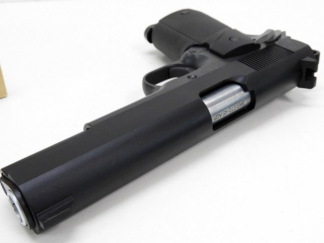 シルバーの樹脂アウターバレルにチャンバーカバーはメタル製BARSTO.45ACP刻印。