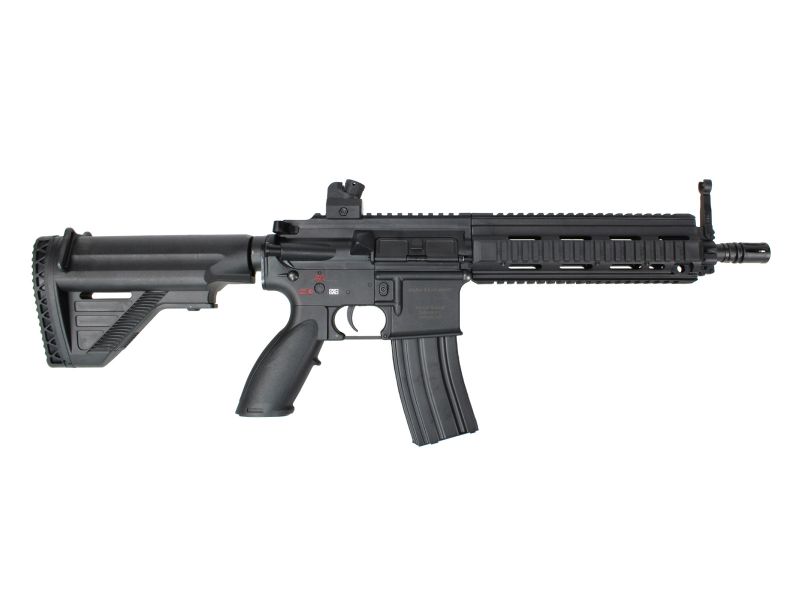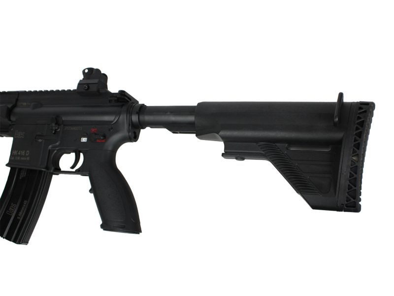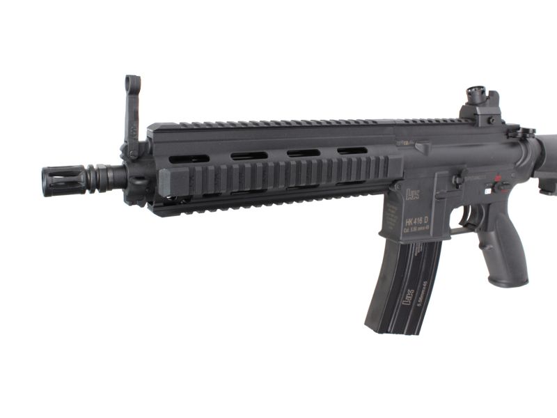 独ヘッケラー&コッホ社が開発したカービンタイプのアサルトライフル。アメリカ陸軍がH&K社にM4カービンの改修を依頼して開発されたもので、全体的なデザインや操作・分解方法もM4と共通している。相違点としては撃発がショートストロークピストン式、ピカティニー・レールシステムの標準装備、スチール製弾倉の採用などがある。HK416Dは公的機関向けモデルで「D」は「Defense」の略。