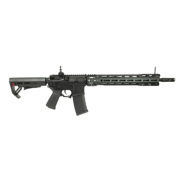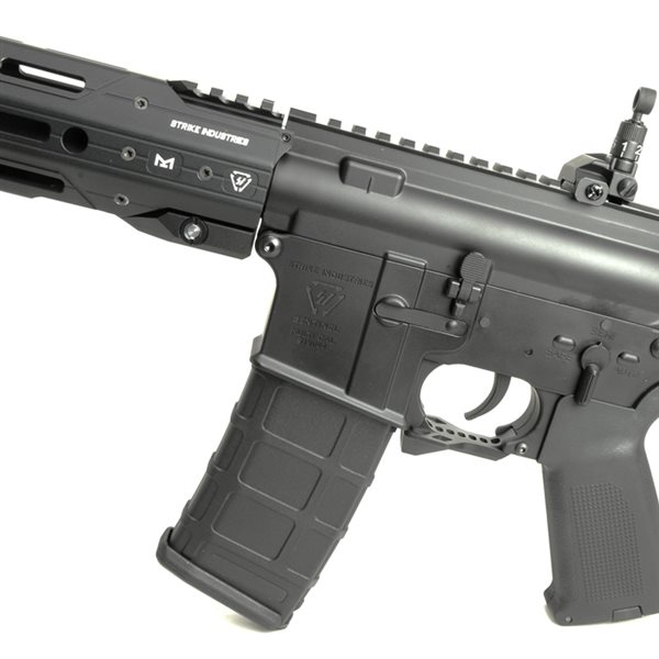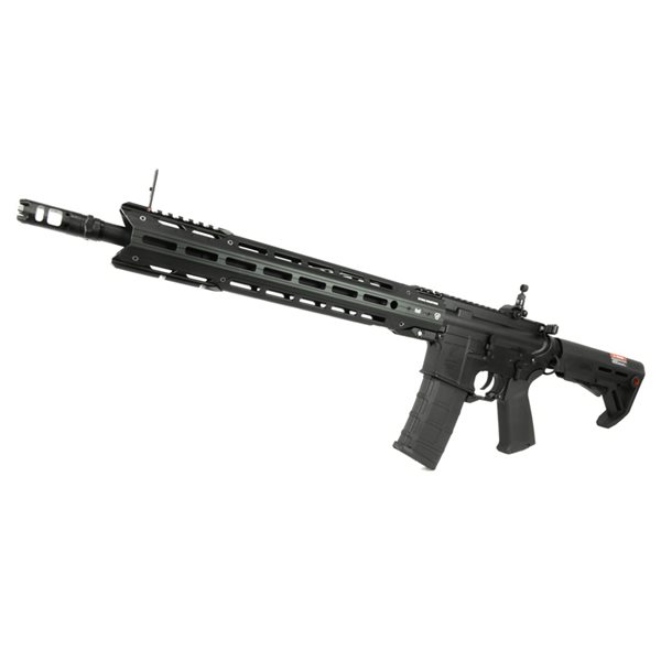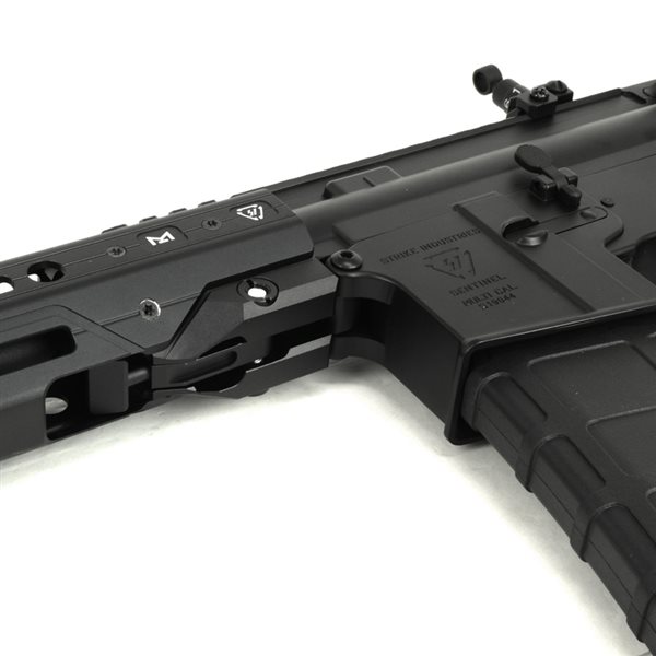 ハンドガードは、M-LOKスロットが備わったメインボディに、レールアタッチメントを組みつける4ピース構造となるGRIDLOKタイプM-LOKハンドガードを装着、Oppressorタイプマズルデバイスを装着可能な King Compタイプハイダー、ハンドルが大型化され利き手を選ばず操作できるSIタイプ ラッチレスチャージングハンドル、小柄でポジション調節ができるMOD1タイプ リトラクタブルストック、グローブ着用を前提に、広いスペースと左右に広がるウイング状のフィンガーレストを持つCobra Billetタイプ トリガーガードを装備したSTRIKE INDUSTRIES製品らしい外観となっています。