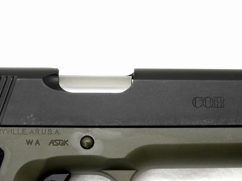 実銃では4種類のカラーオプションが存在する「ウイルソン・コンバットCQB(Close Quarters Battle)」。その内のひとつ、ブラック/OD(オリーブドラブ)の2トーンという独特のカラーリングのモデル。