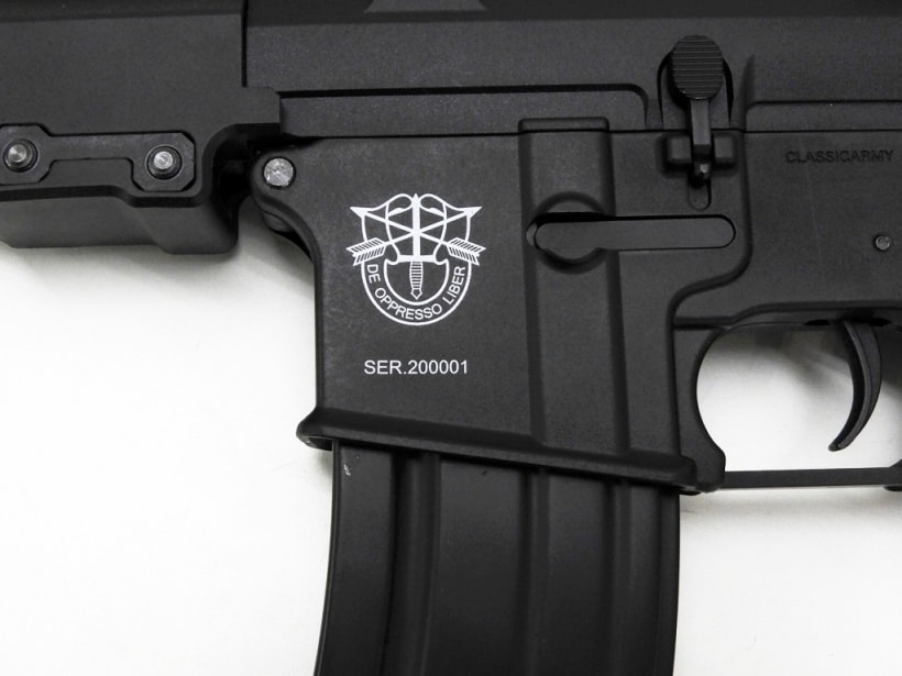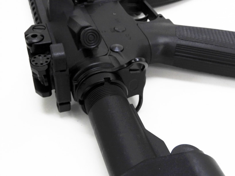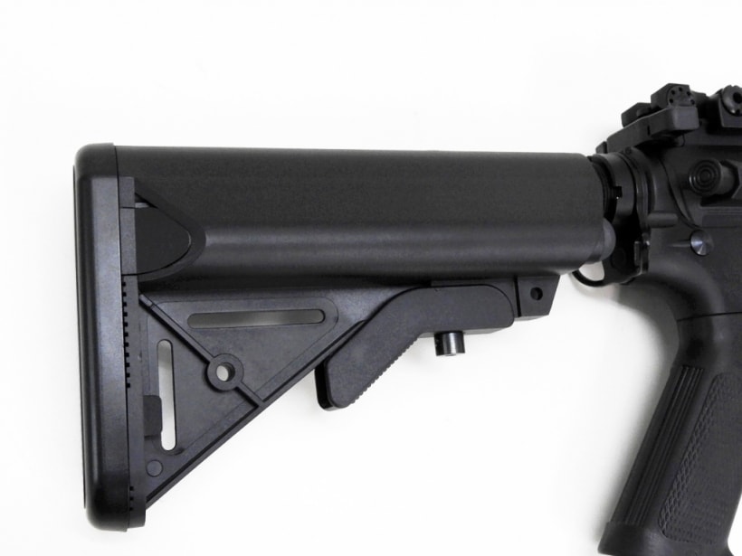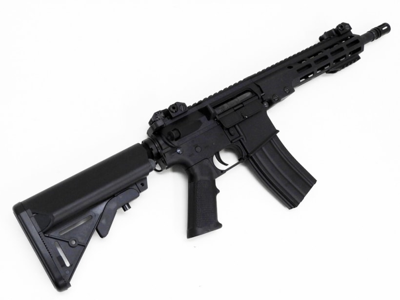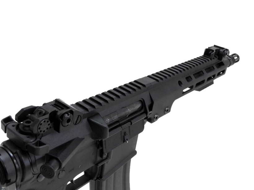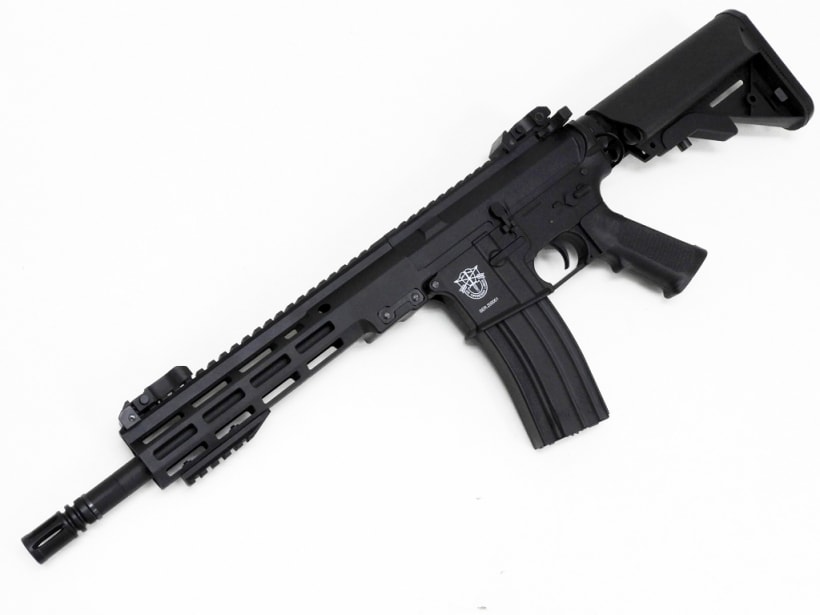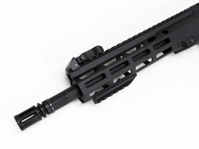 ハンドガードはSMR MK16タイプのM-LOKスロットを備えたレールハンドガードが装着されており、 リトラクタブルストックと組合わせることで取り回しのし易さを確保しながらもバランス良く仕上がっております。