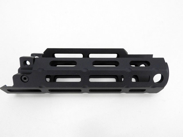 ハンドガードは、MP5本体のハンドガード固定基部を利用しバレルを覆う様に装着されます。 M-LOKスロットが備わったシンプルなワンピース構造で、左右にQDスイベルソケットを備え、拡張性を高め軽量なデザイン。