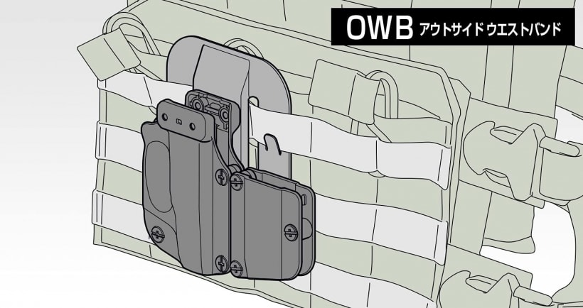 【装着方法】インサイド・ウエストバンド (右利き/左利き/ガンホルスター単体可)、アウトサイド・ウエストバンド (右利き/左利き/ガンホルスター単体可)、モールシステム (ガンホルスター単体可)。【対応状況】幅38?40mm程度、厚み4?5mm程度の硬めのベルト。またはモールシステム。