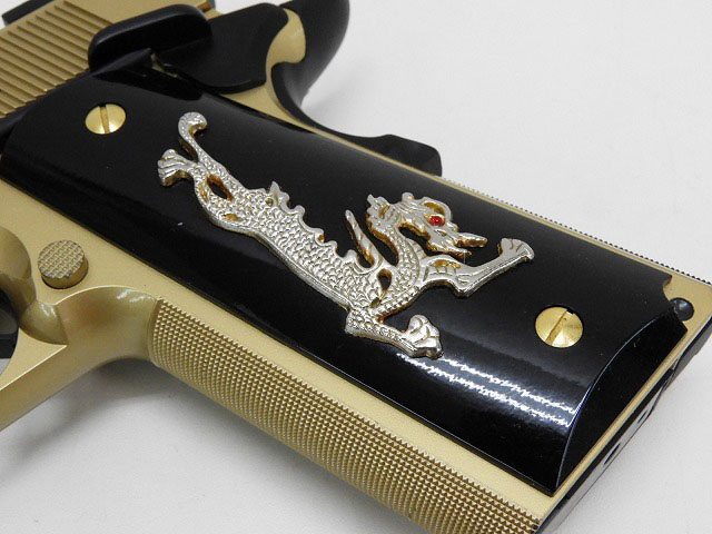 漆黒のグリップに、真鍮製のドラゴン!2丁拳銃でお馴染み黄金色の.45、堂々登場!!最新ロットの物との違いはパッケージの文字と説明書の仕様となっている。