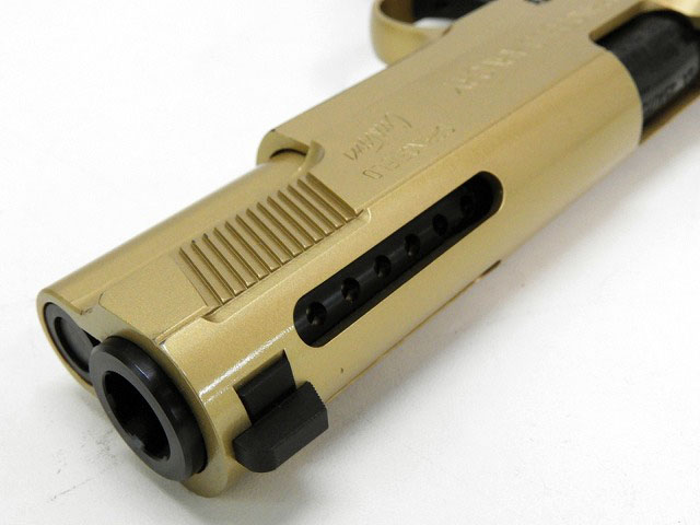 ズッシリとした重量感で人気のヘビーウエイト樹脂は、お馴染みブロンズフィニッシュ仕上。しっとりとした風合いが魅力のブロンズフィニッシュは、当モデル専用に調色されたカラー。専用のヘイニータイプサイトとライトウエイトトリガー、V12ポーテッドバレルが組み込まれスライド側面のコッキングセレーション形状や、コダワリのポートなど、作り込まれたボディを美しく彩ります。