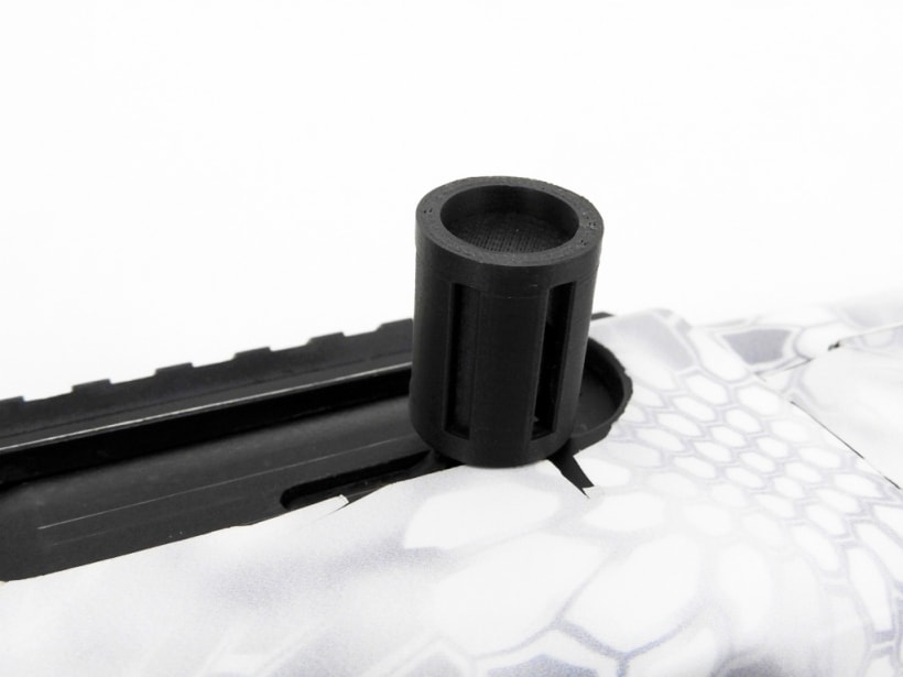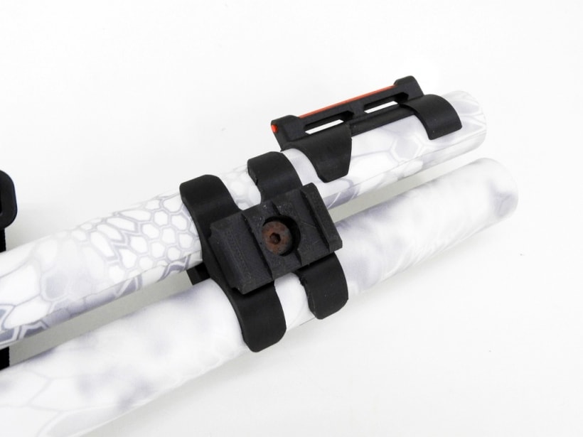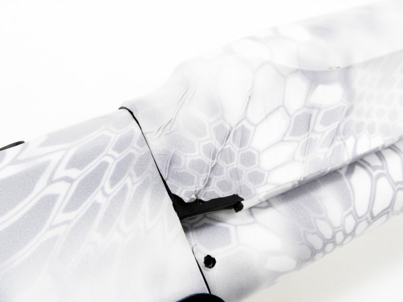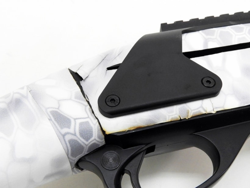 ハンドガードを交換しその上からガンスキンズのクリプテックイエティを貼り付け、チューブ付きのフロントサイトにレール付きのバレルバンドそしてレシーバーにはマウントとボルトハンドルカバーなどが装備されたカスタム。