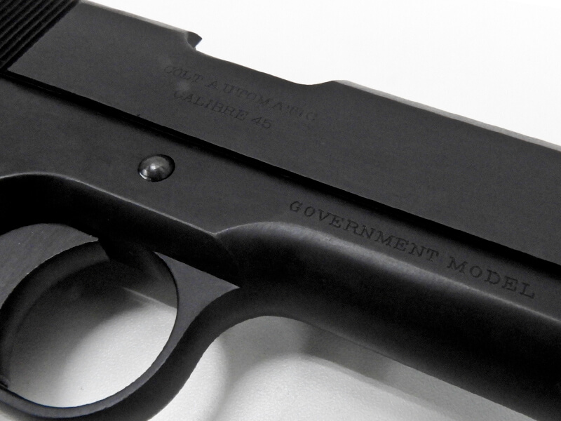 機械加工でスライド側面を切削するミーリング加工が施されたM1911コマーシャル。素材そのものを黒く染めたのちにポリッシュを行う事でリアルな金属感を再現。