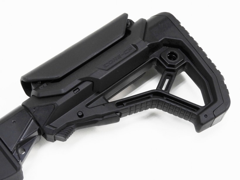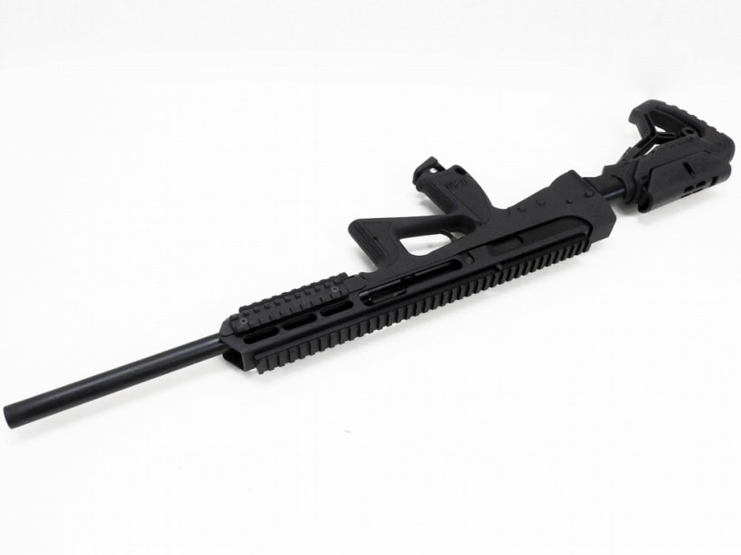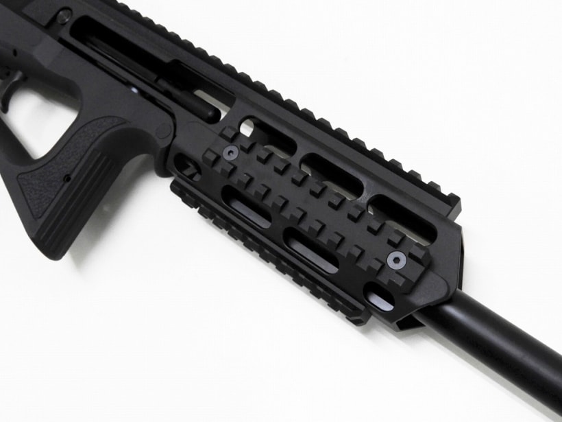 アッパーレシーバーに固定されたCNC加工のアルミレールハンドガードと、M4タイプのストックが使用出来る着脱式アダプターを備え、射撃の安定性と高い命中精度を獲得している。
