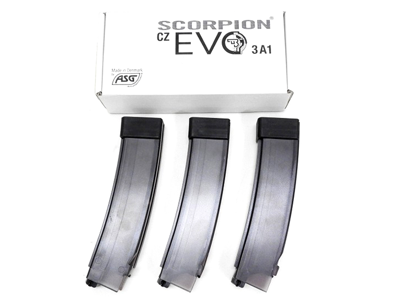 ASG社の CZ スコーピオン EVO3A1マガジン 3個セットです。 半透明のポリマーボディー「スモーキー」 75rdsミッドキャップスコーピオン EVO シリーズ
