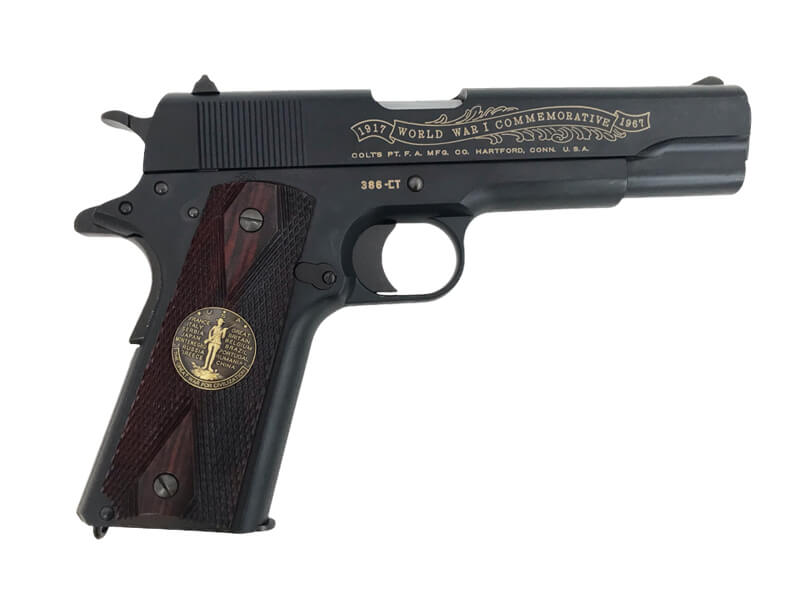 「大口径主義のアメリカ」の象徴とも云えるシングルアクション自動拳銃、 ガバメントの最初期モデルであるM1911。19世紀末の米比戦争で、当時採用していた.38口径弾(.38ロングコルト)の威力不足を痛感したアメリカ陸軍は、よりストッピングパワーの高い拳銃を模索するようになる。コルト社はこれに応え、ブローニング設計のM1900を原形とした大口径自動拳銃と、これに合わせて.45ロングコルト弾を自動拳銃用にブローニングが改修した.45ACP弾を用意した。